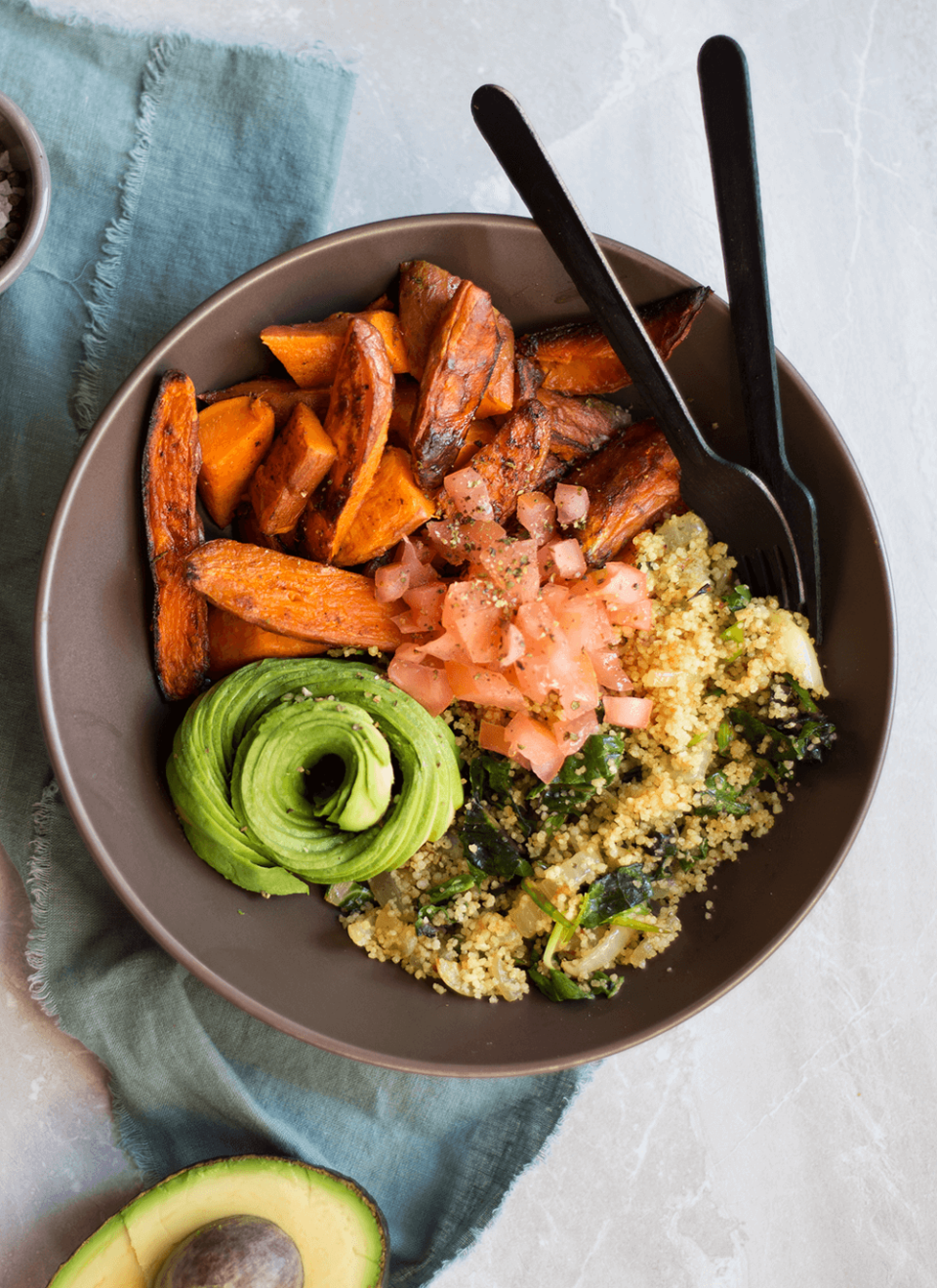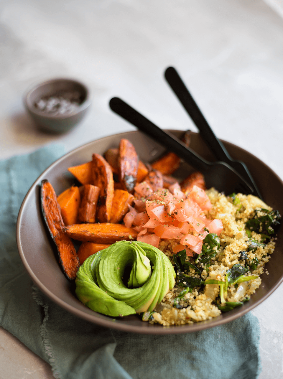 Bake at 450° for 15 minutes. To assemble the salad place two cups of cooked couscous, roasted sweet potato, mushrooms, dressing, salad greens, beetroot and coriander in a large bowl. Drizzle with olive oil, spices and maple syrup. Heat the butter in a saucepan and saute the onion, garlic and mushrooms until soft. Add the passata, stock and sweet potato, add lid, close valve (if not self sealing) and.